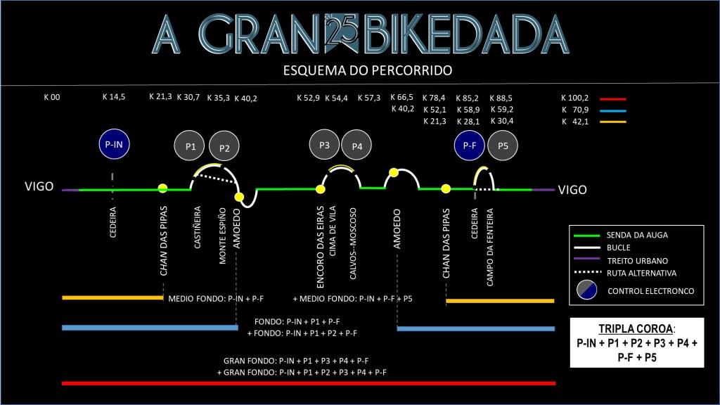 Por si te estas preguntando cuántos tramos cronometrados puedo hacer en A Gran Bikedada 2025, esta es la respuesta: además del recorrido cronmetrado general de incio y final, que obviamente son puntos de paso obligado para todos los participantes, podrás hacer entre 3 y 0 tramos cronometrados, a tu criterio, lo que da idea de la gran flexibilidad que ofrece el recorrido de la edición 2025.