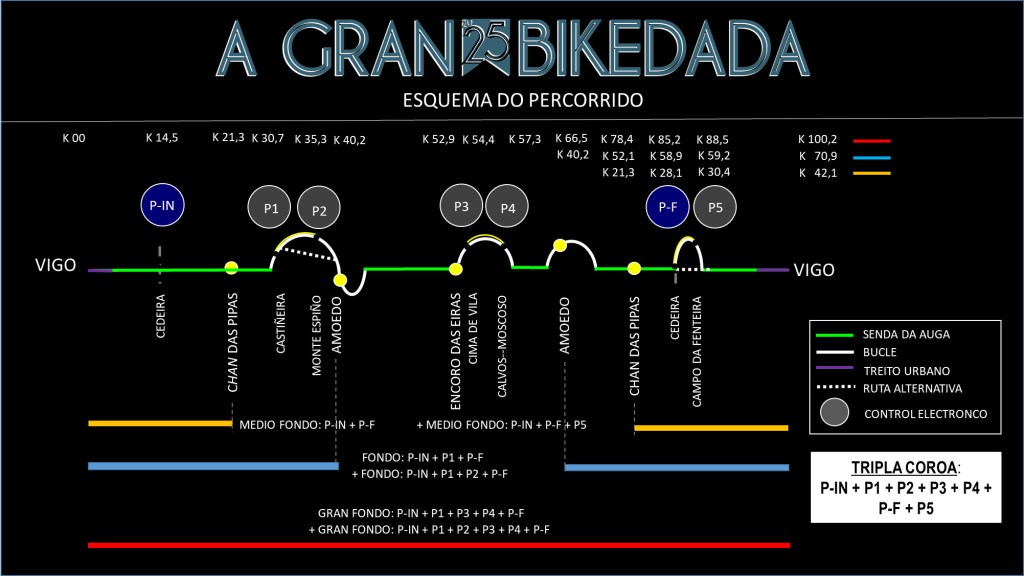 Mi reflexión como participante: “Mi idea es pasar por todas las puertas de recorrido, por eso, al llegar a P-F, después de haber hecho el +Gran Fondo, voy a ir también a la puerta P5. Quiero hacer los tres tramos cronometrados parciales, porque tengo curiosidad por ver mi rendimiento en esfuerzos intensos espaciados en una distancia de 100 km. Y claro, quiero ver en qué posición quedo en la Tripla Coroa de A Gran Bikedada 2025”.