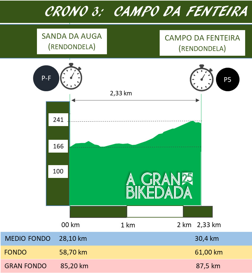 Crono 3: Comienza con un fuerte repecho sobre asfalto, que puede ejercer un efecto un poco disuasorio para algunos participantes por encontrarse al final del recorrido, pero es corto.