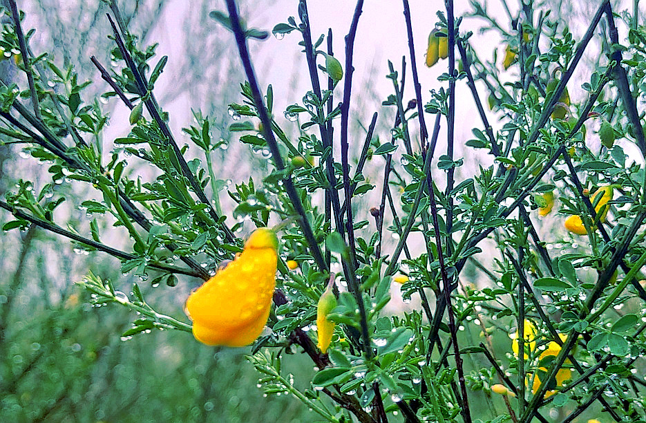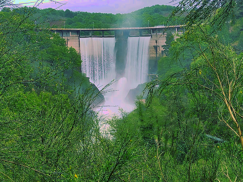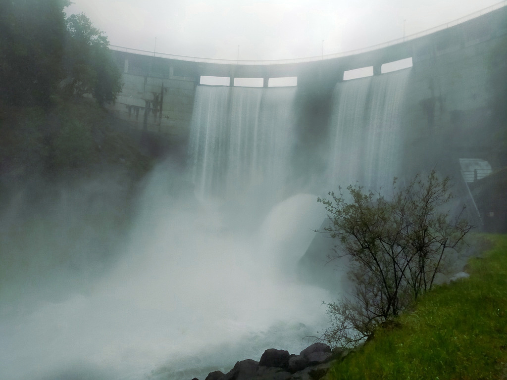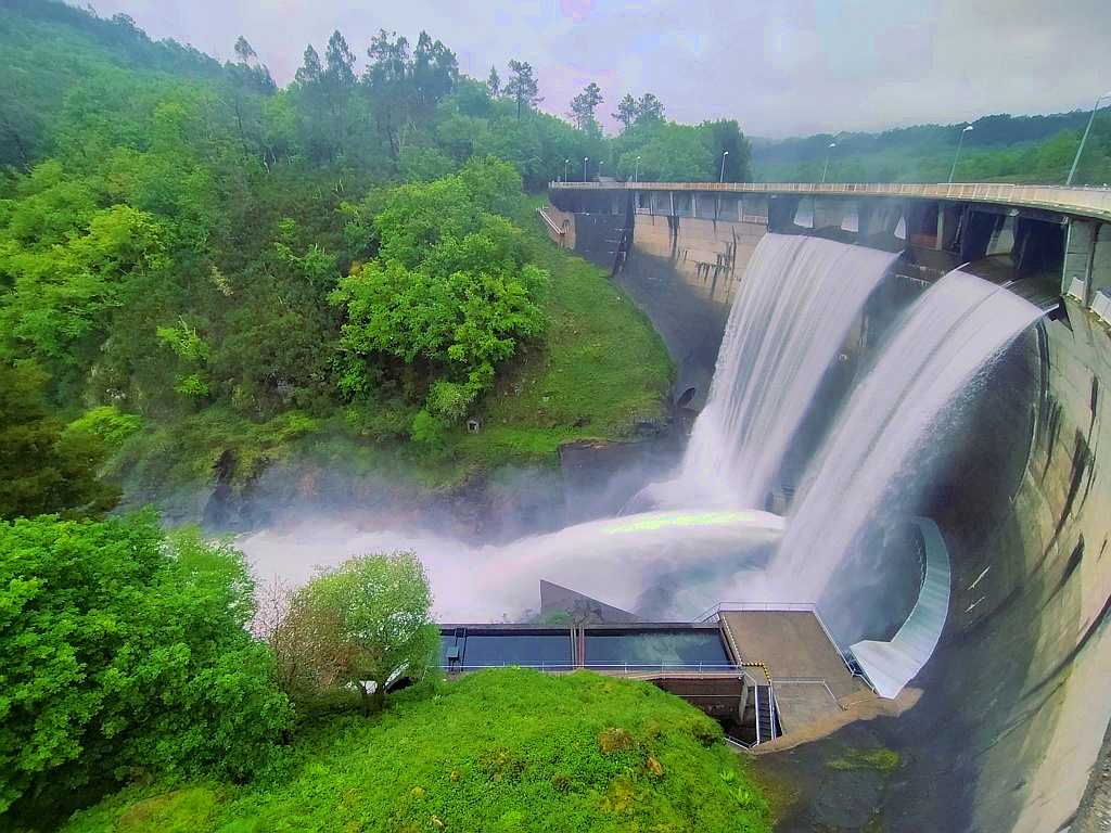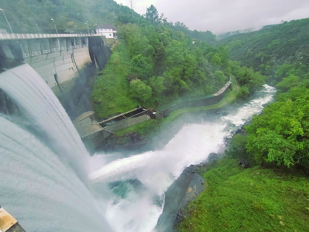 El Embalse o Encoro das Eiras, referente se encontraba esta Semana Santa, literalmente, rebosante; el agua acumulada se desbordaba por la parte superior, desplegando sobre la presa, de arriba abajo, dos enormes cortinas blancas y vaporosas, tan vaporosas que en parte se deshacían en la fuerte caída vertical en pequeñas nubes de vapor, creando en el ambiente un halo sutil de irrealidad.