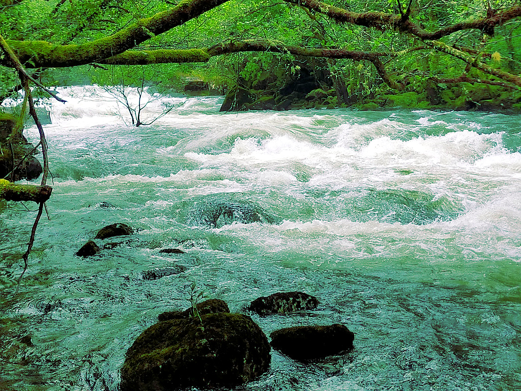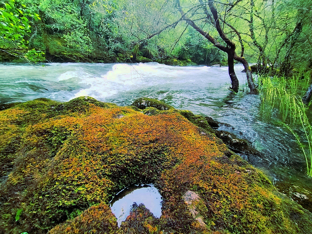 El río en este tramo alto discurre con prisa, salvaje y distante para en ciclista o senderista. Sus aguas, atrapadas en el embalse, cuando tienen la oportunidad de abandonarlo, salen furibundas cauce a bajo, sin miramientos, arrastrando ramas y troncos y batiendo contra las rocas, que aguantan el embate firmemente, pero amoldándose poco a poco a lo que la corriente quiere: superficies lisas, suaves y sin aristas, que faciliten el correr dell agua.